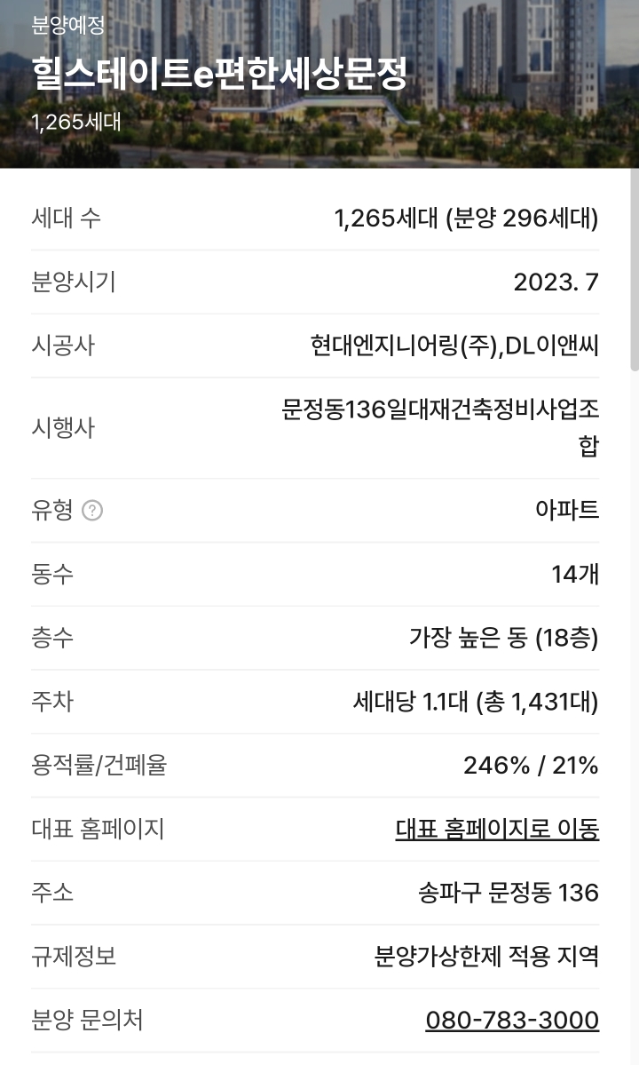 일반분양 : 1265세대 중 296세대